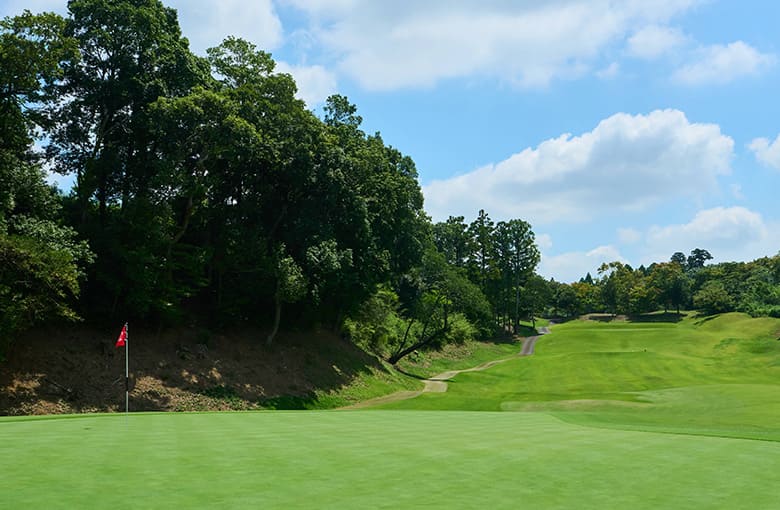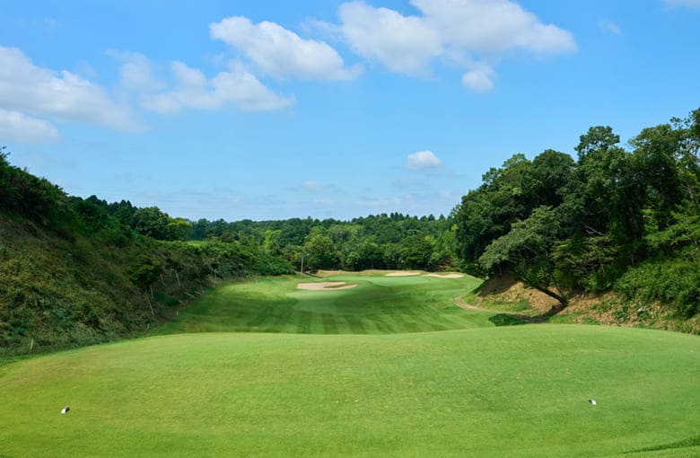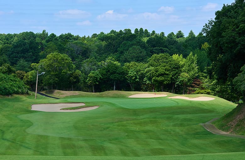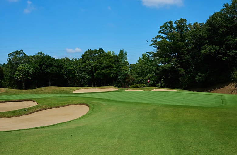 打ち下ろしのショートホール。 手前から上がり奥に下りる2段グリーン。 左前バンカーは要注意。